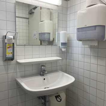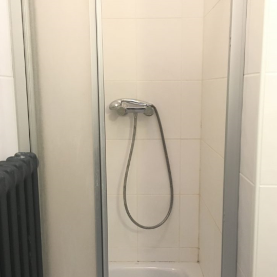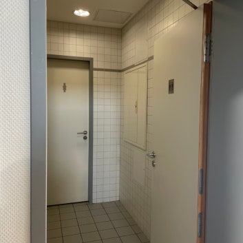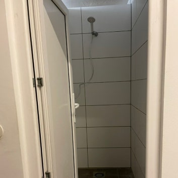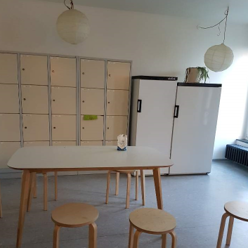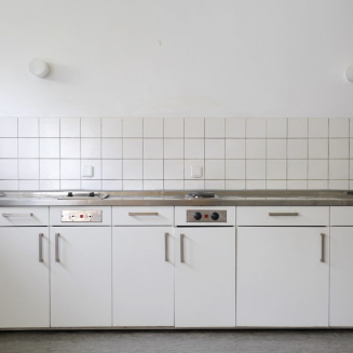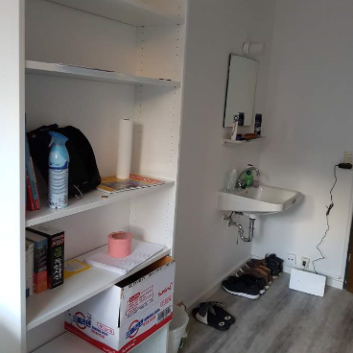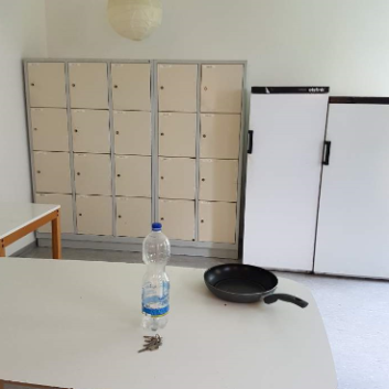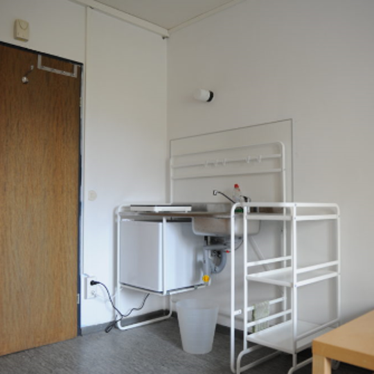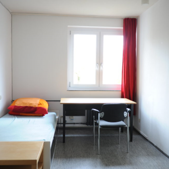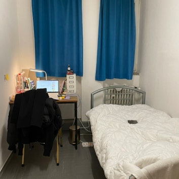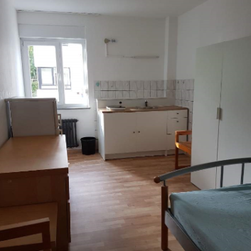 Typ IV Zimmer möbliert mit einem Bett, einem Schreibtisch, einem Kleiderschrank und Stühlen. Jedes Appartment ist versehen mit einer Kochgelegenheit und Geschirre, einem Waschbecken. Im Flur befinden sich zwei Toiletten und zwei Duschen, sie sind nur für 4 Zimmer verfügbar.